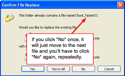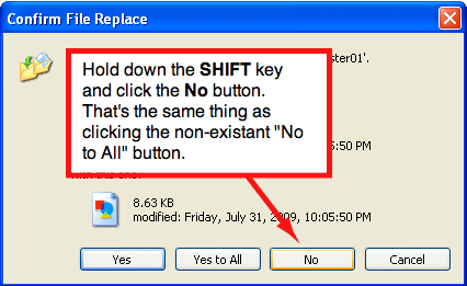 - But there’s a trick - hold down the Shift key on your keyboard, and then click No. That will tell Windows that you don’t want to overwrite any of the files you’re copying - a hidden “No to All” feature.
